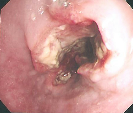 不明瞭な輪郭で、汚らしく赤くデコボコと盛り上がったところが、癌の一部です。食道上皮の裏側へ病変が広がっていると思われます。